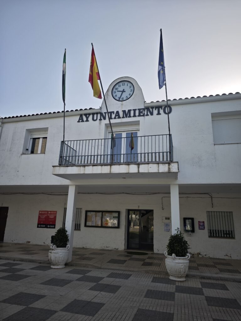 Uno la mira y no hace falta leer una placa para saberlo: esto lo diseñó el Estado franquista, buscando imponer orden, identidad y futuro en una Extremadura aún por transformar. A un lado, el ayuntamiento, funcional, geométrico, con su balcón para discursos y su reloj vigilando el tiempo del pueblo. Es el lenguaje del urbanismo de Franco hecho ladrillo: claro, sencillo, pero cargado de intención.