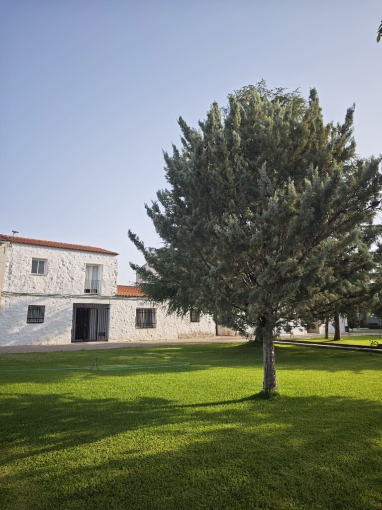 Hernán Cortés conserva excepcionalmente bien los rasgos del urbanismo franquista: manzanas geométricas, viviendas encaladas en serie, plazas amplias, ajardinamiento planificado, espacios públicos proporcionados. Y, a la vez, muestra una capa nueva: la de las casas modernas que se levantan en la periferia, la de las vidas jóvenes que llegan y deciden echar raíces en un pueblo nacido por decisión del régimen de Franco.