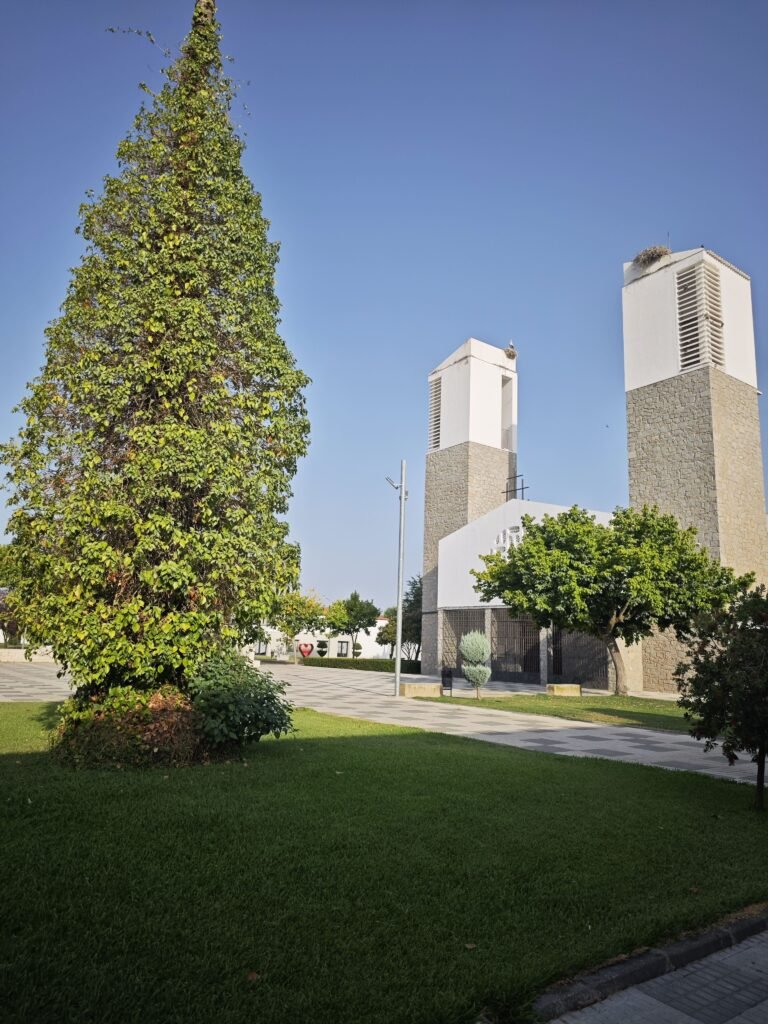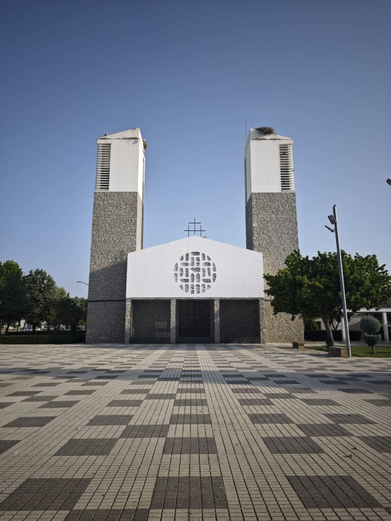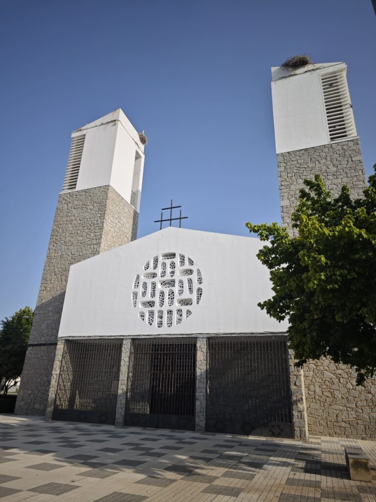 La iglesia de Hernán Cortés —alta, blanca, solemne— lleva en sus piedras una estética que solo se entiende sabiendo de dónde viene. Es arquitectura franquista pura, de colonización: